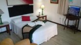 Os quartos são amplos, climatizados e contam com TV de tela plana, frigobar, mesa de trabalho e banheiro privativo. Algumas acomodações possuem varanda com vista para o mar — um verdadeiro convite para relaxar.