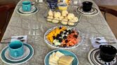 O café da manhã é um dos destaques da hospedagem: farto, artesanal e com produtos locais — queijos, pães caseiros e frutas frescas colhidas na própria região.