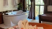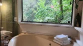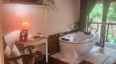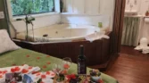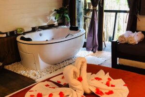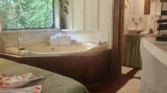 Entre os diferenciais do chalé estão a lareira aconchegante, banheira de hidromassagem e varanda com vista para o jardim, criando o cenário perfeito para momentos românticos ou dias de descanso longe da correria da cidade.