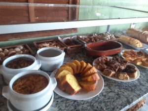 Um dos pontos altos da Pousada Pé da Mata é o café da manhã artesanal, preparado com ingredientes locais e muito carinho. Pães, bolos, queijos e sucos naturais fazem parte dessa experiência tipicamente mineira, elogiada por quem já se hospedou por lá.